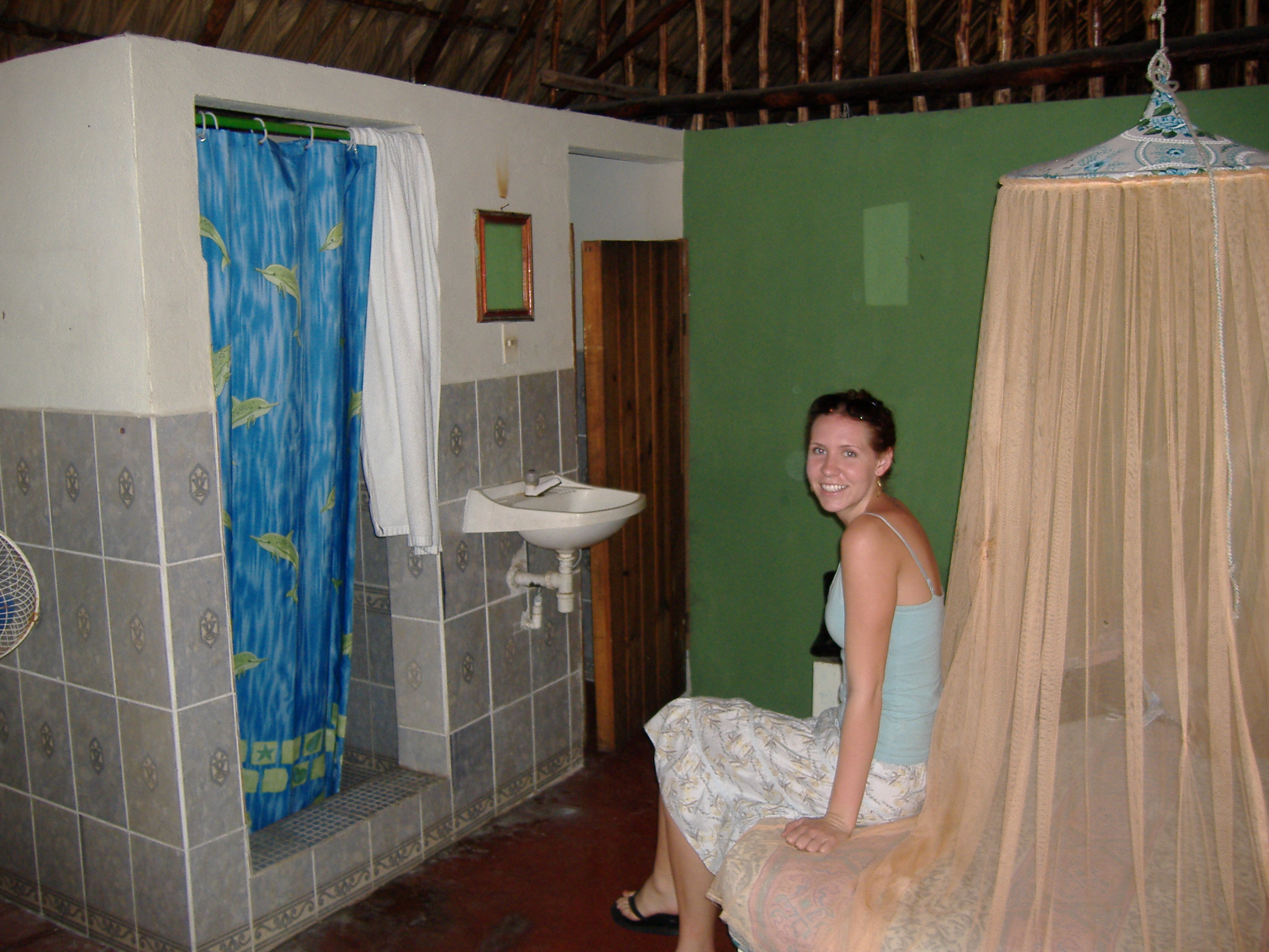 I don’t actually have a picture of the inside of any Central American showers, but here is the outside of one in Guatemala. Notice the thatched roof. There is no protection against critters at all!