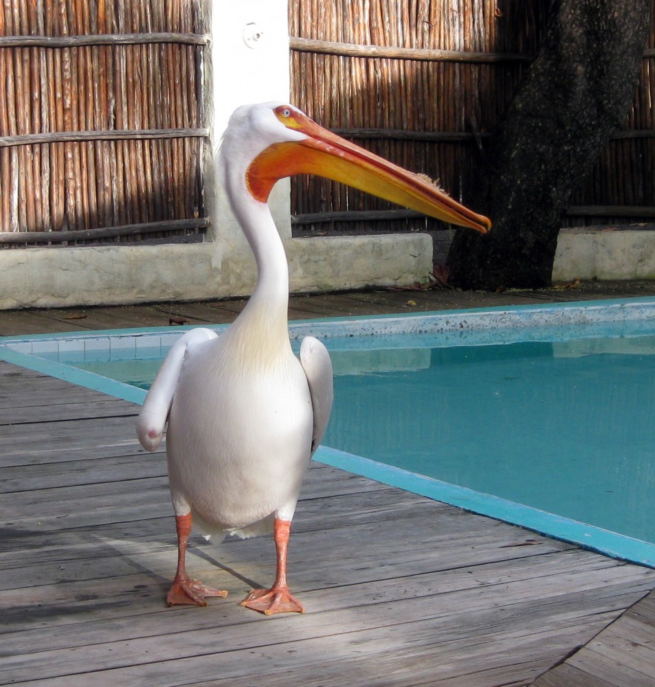 I think one of us might have let out a little scream. I don’t think it was Andy. I quickly retreated to behind our pool’s privacy fence; I saw no need to push my luck when it came to a pushy pelican. Meanwhile, Andy, completely ignoring my pleas to get to a safe distance because wild animals can be dangerous and we know nothing about pelicans, kept investigating.