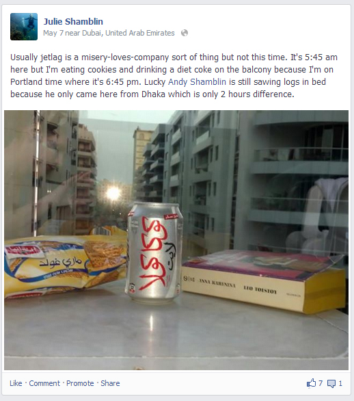 My complaint is this: my jet lag was a little lonelier than usual. Going half-way around the world throws you into a crazy tailspin and usually I have Andy right alongside me laughing about the fact that we are waking up from a six hour nap at 5 PM or scurrying around town at 3 AM trying to buy sandwiches or ice-cream. But not this time… here’s a screenshot of my Facebook page to further explain my woe-is-me jet lag.